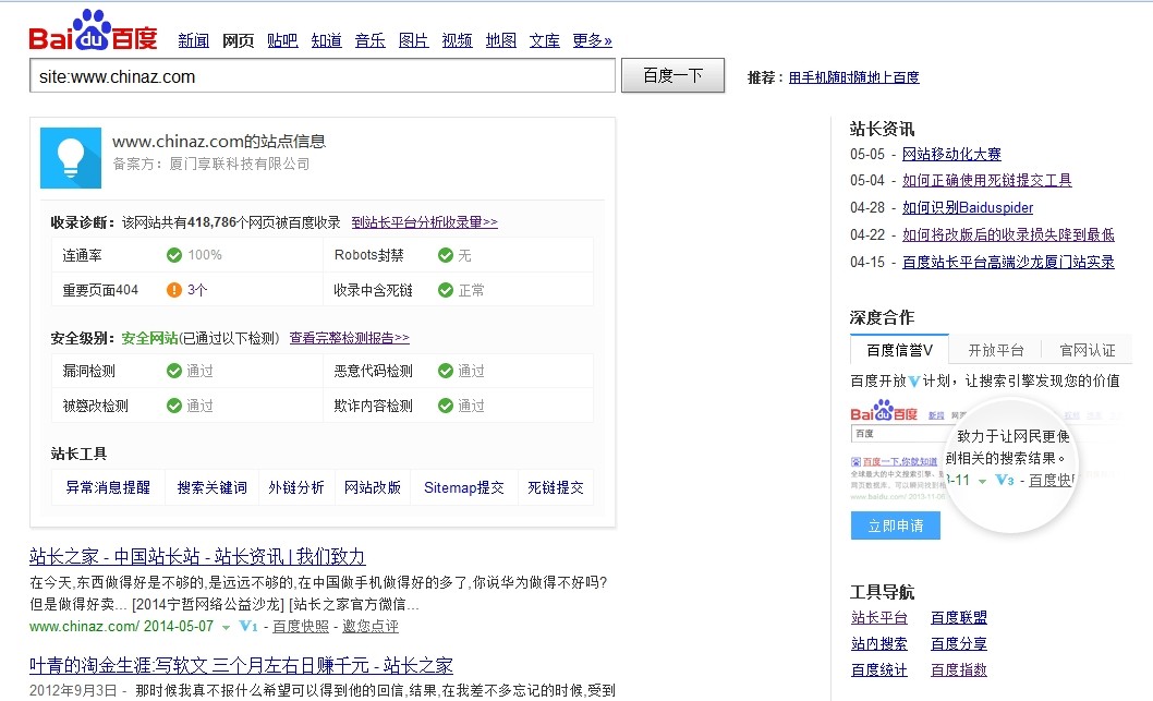 來百度搜索引擎site自己的站點是站長經常要做的事情之一,最近站長site站點后眼前一亮:site結果展現升級啦!新的site特型中有四大部分內容與百度站長平臺相關,為站長使用百度站長平臺工具提供了更便捷的入口: