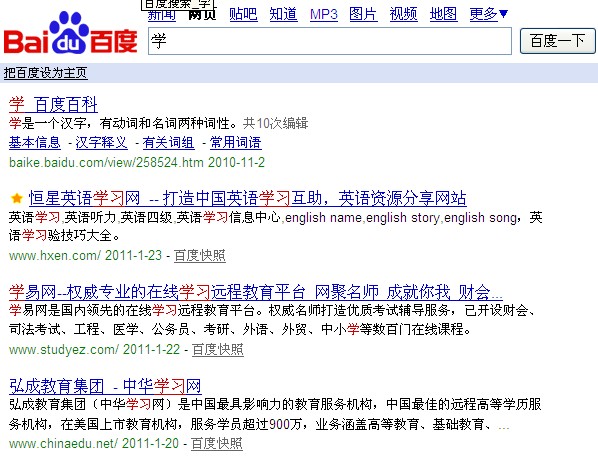 2、基于統計:百度把一個詞標紅的原因:標紅的詞一般是一個關鍵詞,你搜索“學”字的時候,百度它自認的把“學習”也當成了一個關鍵詞,所以出現“學習”這個詞標紅,這就是百度分詞法:基于統計分詞。