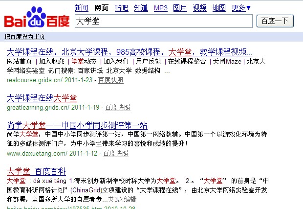 1、基于理解:傻瓜式匹配,小于等于3個中文字符百度是不進行切詞的,比如搜索“大學堂”。