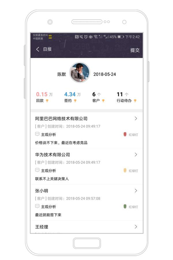 1)基于客戶的日報。關于客觀回溯的內容,實際并不需要銷售花額外的時間。銷售當天跟進了哪幾個客戶、有多少回款、簽約了多少、設置了多少個行動待辦,進入快目標的日報列表,一目了然。