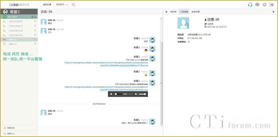 該呼叫中心平臺的界面設計人性化,操作簡單、方便。客服與用戶交流時,可以使用文字、表情、語音、圖片、位置等多媒體消息交互;支持在聊天的過程中,將聊天轉交給其它指定的座席,或加入指定其它座席參與到該聊天中,形成三方會議;在企業無人值班時,可啟用客戶留言功能,上班時間再查看處理。