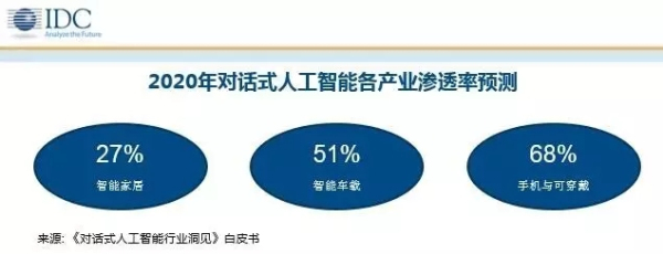 對(duì)話式人工智能的應(yīng)用呈現(xiàn)在多個(gè)領(lǐng)域,以智能家居、智能車載、手機(jī)與可穿戴設(shè)備最為典型。目前,IDC對(duì)智能家居、智能車載、手機(jī)與可穿戴設(shè)備的滲透率進(jìn)行了評(píng)估和預(yù)測(cè)。