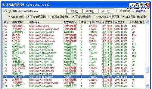 軟件操作非常簡單,運行軟件后只需輸入自己網站的網址,點擊“開始”后便自動開始檢測。軟件自動檢測對方網站的收錄、PR值等信息。如果嫌軟件太麻煩,還可以登錄tools.jb51.net,進行在線檢測。