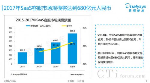 易觀智庫的一項研究稱,預計到2017年,中國SaaS客服市場交易規模將增長至680億元人民幣,并將繼續保持快速增長。