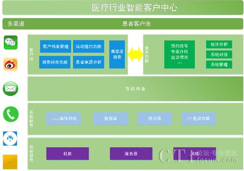 當患者通過電話、微信、在線客服、郵箱、微博、app等渠道聯(lián)系到客服,客戶中心可以一站式受理患者所有請求。通過接口對接,連接醫(yī)院內(nèi)部系統(tǒng),方便患者進行預約掛號,健康咨詢等需求??头藛T可以快速知道患者的已有情況,從而進行針對服務。