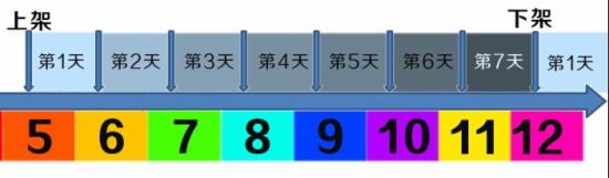 上圖中,在天數里填充的顏色越深說明權重越高,排名越靠前。如果我們10號晚上24點下架的話,寶貝最高權重點在10號白天,這段時間我們如果能搶到好的排名,是可以讓那些有欲望購物、正在提前搜索,想確定購物清單的顧客看到我們。這樣我們可以搶奪先機,提前占據顧客的大腦。