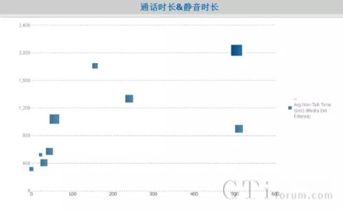 針對靜音時間,為了能夠快速發現問題員工,我們將靜音時間和通話時間進行分析交叉分析,結果發現問題主要集中在個別員工身上。透過數據,我們非常清楚地了解這些電話都是由哪些員工完成的,是哪個小組的員工,然后針對這些員工進行人員管理干預。