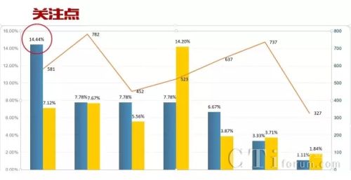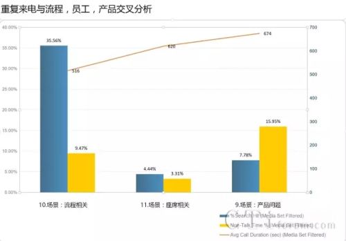 帶著這個問題,我們繼續深入,把重復來電與流程、員工、產品交叉分析后發現圖中所呈現的主要業務中,有四種業務重復來電的占比在7%以上,其中(圖中的關注點)問題占比非常明顯,大約是14%,是其它業務類型的兩倍,我們就先分析此業務流程的優化空間。與此同時,另外一個數據引起管理者的注意,某個業務的靜音時長非常高,平均靜音時間五百秒。