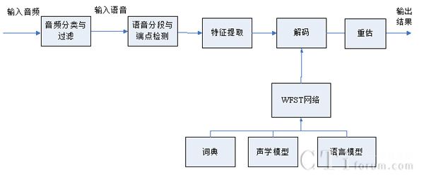 在輸入的聲音中,檢測出可靠的語音,排除靜音、背景噪聲、音樂等,判斷男女,實時送入語音識別解碼器進行識別。