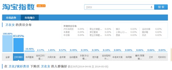 淘寶指數是淘寶官方推廣的一個免費工具,對小賣家有很大的幫助。通過此工具可以分析寶貝的市場走向,研究消費者的年齡、地域、消費層級、星座愛好等數據信息,進入淘寶指數點擊市場細分,可以清楚地告知我們市場需要什么類型的產品。如搜索“衛衣女”這個關鍵詞,有82.21%是購買了衛衣/絨衫類目,而且這個類目下的寶貝即使是休閑套裝類目也很適合,但我們要選擇最優類目的,若放錯了類目,就算關鍵詞在標題里面也很難讓買家找到你!因此,類目來說一定要放對。