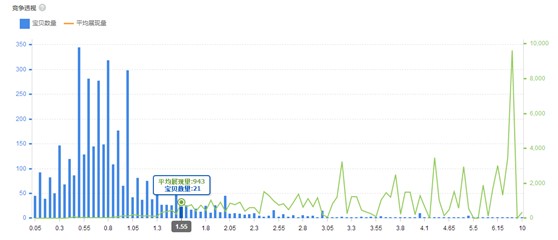 如查詢婚紗禮服這個關鍵詞,通過競爭透析數據我們看到當出價1.5元時寶貝數量是68,平均展現量是237:;而當出價1.55元時,只是提價了0.05,此時的競爭寶貝數量就降到了21個,平均展現量提高到了943,出價只提高了0.05,競爭就少了3倍,這是不是就很值得了呢?