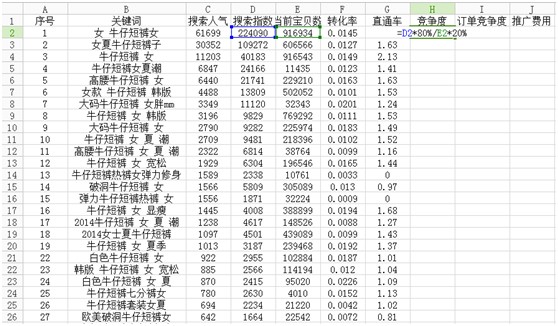 如,我們以女士牛仔短褲為例,在數據魔方中搜索牛仔短褲女,把有關牛仔褲女的相關關鍵詞都復制粘帖到Excel表格,并提取相應數據。
