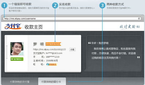話說還有很多人不知道這個收款主頁,當然平時用不到的人不知道很正常,順便普及下,不然這個頁面也死得很冤。簡單的說,這個收款主頁就是有你的賬號信息的提供給別人的付款頁面(如圖),把鏈接發(fā)給付款人,然后付款人直接在這頁面打錢就是了。話說小馬哥為什么會突然斬殺這個收款頁面呢,八成跟移動支付有關。
