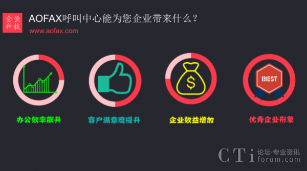 此外,AOFAX呼叫中心還內(nèi)嵌了企業(yè)聊天、在線客服、語音自動導航IVR、智能ACD路由功能、來去電彈屏、無紙傳真、知識庫和電話錄音等功能,為企業(yè)搭建一個一體化的呼叫中心系統(tǒng)。更多語音外呼系統(tǒng)和呼叫中心可以咨詢中國傲發(fā)網(wǎng)(www.aofax.com)