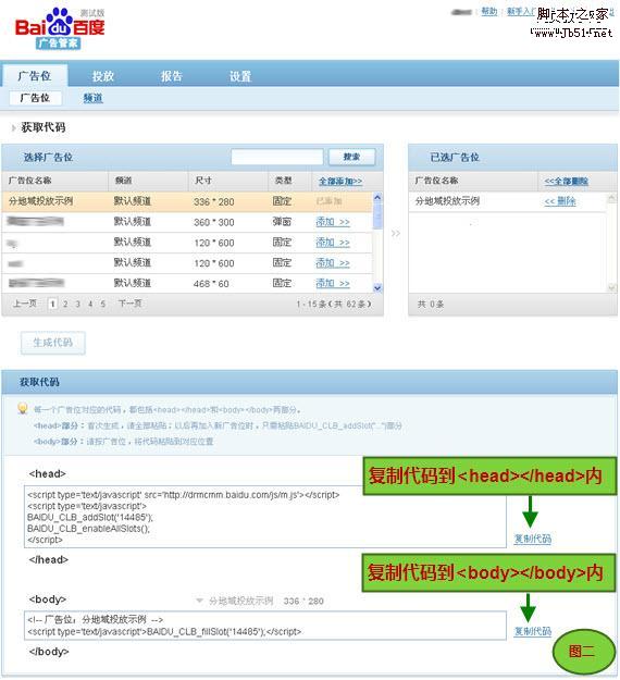 2) 廣告位創(chuàng)建完成后,選擇立即獲取代碼,進(jìn)入獲取代碼頁面,根據(jù)提示將代碼投放到您的網(wǎng)站,如圖二所示。