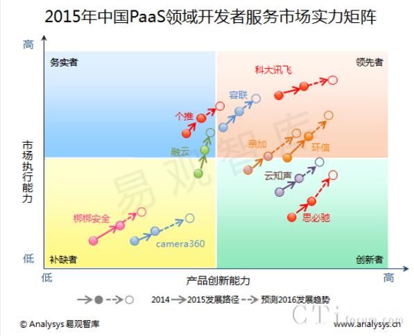 Analysys易觀智庫近期發布《2015年中國PaaS領域開發者服務市場實力矩陣專題研究報告》,對2014年至2016年PaaS領域內主要開發者服務廠商在實力矩陣中所處的位置以及執行能力和創新能力的變化情況作如下解讀。其中,環信憑借穩健的產品布局優異的產品創新能力,以及領軍行業的市場表現,榮登易觀智庫2015年中國PaaS領域開發者服務市場實力矩陣領先者象限。