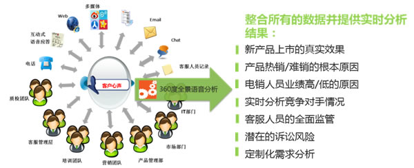 數(shù)據(jù)的全景:進(jìn)行全面基于客戶心聲的全面分析,同時(shí)和大數(shù)據(jù)系統(tǒng)結(jié)合打造呼叫中心360度全景視圖。