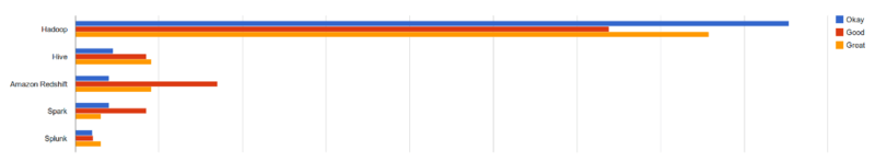 AngelList 把這些企業分成 3 檔,一檔是 “過得去”,其使用的技術用藍色表示;一檔是 “好”,用紅色表示;最后一檔是 “極好”,用橙色表示。然后分析了各檔公司在編程語言、前端技術、數據庫 / 存儲 / 緩存、移動技術、基礎設施、DevOps、API 集成、先進技術、大數據軟件等方面的使用情況。從中可以看出,各類技術的總體趨勢是: