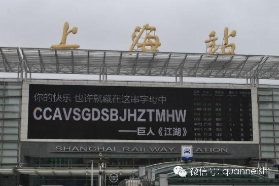 今年3月份,在人流眾多的上海火車站廣場以及候車室內,出現了神似當年“谷歌謎題”的廣告牌,巨人網絡放出來的——“你的快樂也許就藏在這串字母中,CCAVSGDSBJHZTMHW——巨人《江湖》”。
