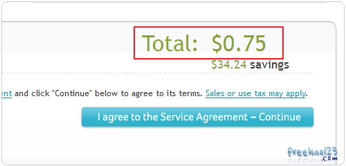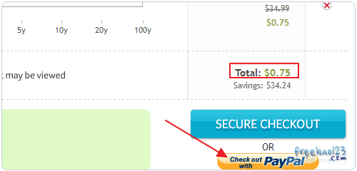 7、確定后,你會發現使用優惠碼后域名的價格已經變成了0.75美元一年了。可以用Paypal付款。
