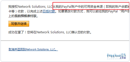 2、注意這里Network Solutions要求我們同意Paypal從余額或者信用卡中自動扣款的協議,點擊“繼續”。