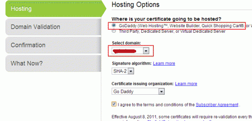 6.進入GoDaddy SSL證書管理界面,選擇將SSL證書安裝在GoDaddy主機上,然后選擇已經綁定在GoDaddy主機上的域名,然后點擊“Next”進入下一步。