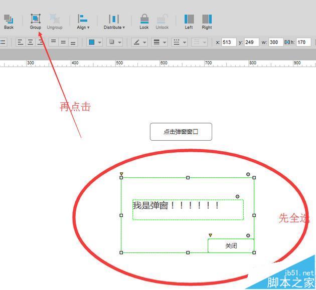 3、把彈窗組合成一個整體,全選然后快捷鍵ctrl+g,或者界面點擊group