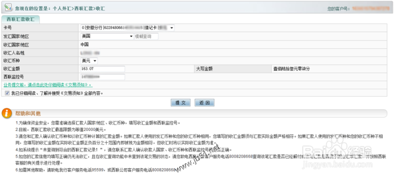 3、審核通過后即可收取匯款,填寫收匯金額以及西聯(lián)監(jiān)控號。