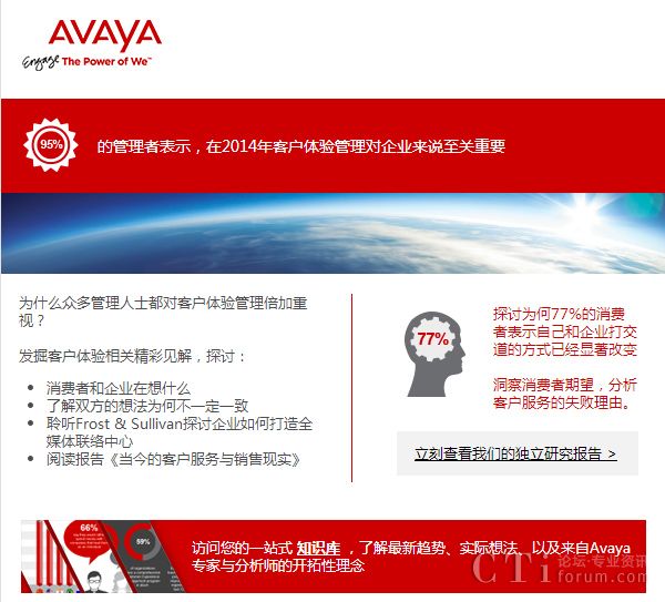 Avaya委托第三方調研公司對于全球聯絡中心市場進行了深度調研。 本次調研涉及了24個國家的2191家企業(員工數在1500名以上)的負責客戶關系管理的中高層管理人員,和13003名消費者。 通過此調查報告,可以深入了解消費者的行為喜好,以及他們希望同聯絡中心進行交流互動的方式。調查結果清晰表明,消費者的行為與偏好已經發生了根本改變,企業正在致力滿足消費者的這些期望。進而指出,企業要想取得成功,就必須努力提供更加優質的客戶互動,超越客戶預期。 點擊下面鏈接可以下載2014 全球市場調查報告(中文版): http://www3.avaya.com/cn/campaign/cem_hub/index.html?CID=GG-FY15Q1-CEM-Hube=