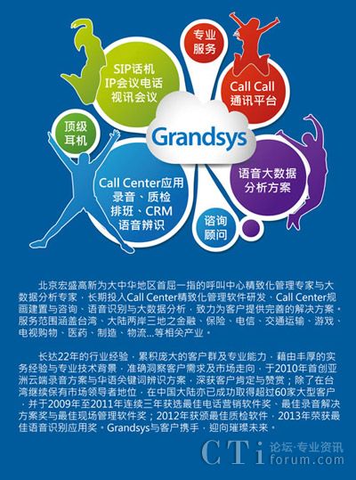 Grandsys以豐富的行業知識為基礎,專注于自有品牌產品的研發,于臺北與南京設立研發中心,擁有超過60%的技術人力與堅強的設計研發團隊,并陸續推出LOG8000錄音系統、QMS8100質檢系統、WFM8200人資優化系統、eVoice8300電銷與客戶服務系統,為企業打造完整的呼叫中心管理平臺。