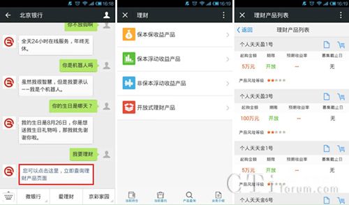 “小京”的工作范圍不僅局限在銀行業務的辦理上,如果你手里有恰好有一筆錢,定期儲蓄又覺得利率太低,那只需要到微信窗口說一聲“我要理財”,“小京”就會為你提供整個北京銀行全套理財方案。無論你是想保本,還是想投資,或是想冒點風險去嘗試高回報的基金和股票等,都可以找到適合的產品,更為貼心的是,“小京”還隨時隨地提供最新的理財動態,保證你的收益是最大化的。