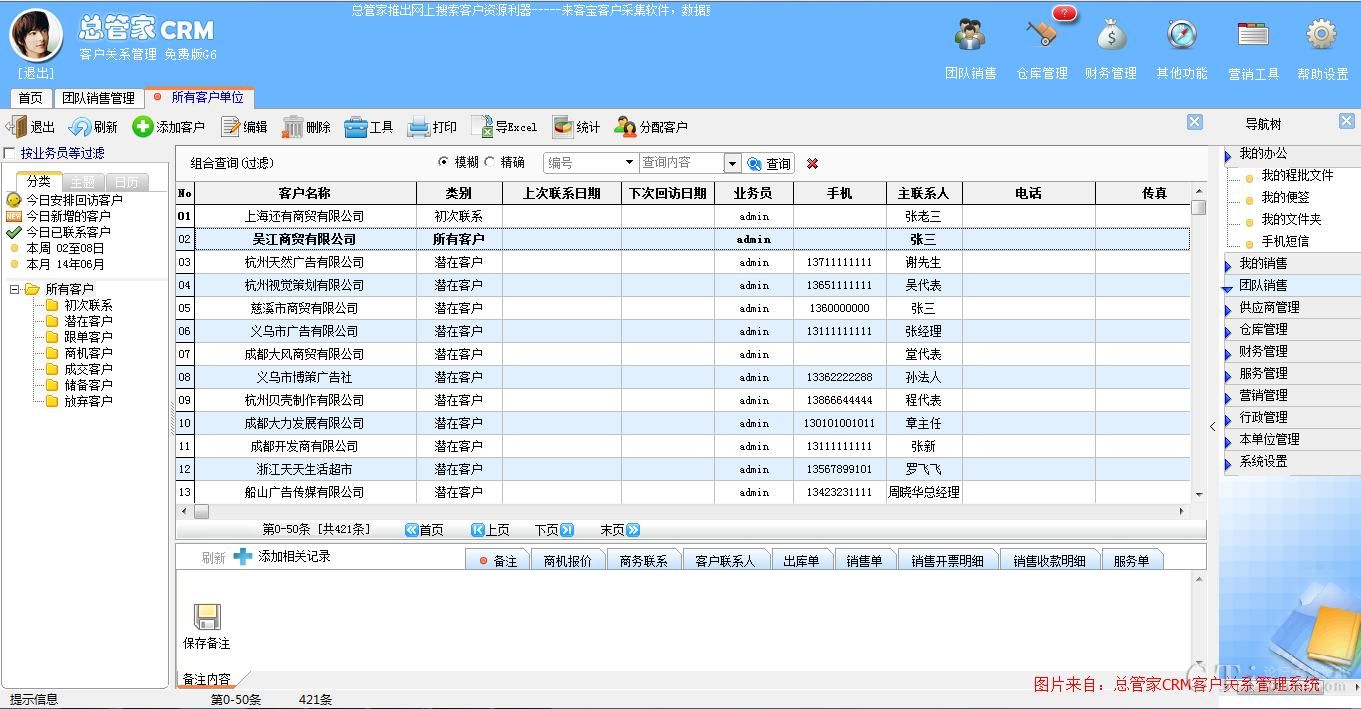 任丘永利使用總管家軟件一段時間后,客戶管理水平明顯提升,使用軟件就可以管理客戶資料,跟單聯系記錄,客戶拜訪安排,客情維護,銷售訂單管理,工作提醒等功能。業務員將客戶資料錄入或者EXCEL導入到系統,就能夠實時掌控客戶跟進的最新情況。