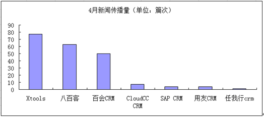從新聞傳播量來看,本月新聞傳播量最高的是Xtools,其新聞傳播量為77篇次,八百客同樣緊隨其后以63篇次次之,百會CRM的新聞傳播量為50篇次。除此之外,CloudCC、SAP、用友、任我行的新聞傳播量均為個位數(shù)。