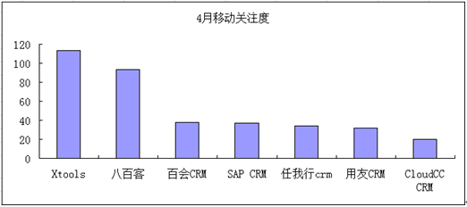 在移動關(guān)注度方面,Xtools和八百客同樣不相上下,分別以113和93的移動關(guān)注度指數(shù)位居前兩位。而百會、SAP、任我行、用友、CloudCC在移動戰(zhàn)略上明顯延后,其移動關(guān)注度指數(shù)沒有明顯的差異,基本都在30左右。