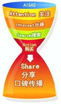 在互聯(lián)網(wǎng)和電子商務(wù)快速發(fā)展的大背景下,AISAS模式應(yīng)運(yùn)而生。這是由日本電通廣告公司針對(duì)互聯(lián)網(wǎng)時(shí)代消費(fèi)者的消費(fèi)行為提出的消費(fèi)模式,它總共包括五部分:Attention(關(guān)注)、Interest(興趣)、Search(搜索)、Action(購(gòu)買(mǎi))、Share(分享)。首先由企業(yè)引起消費(fèi)者的注意,吸引他的興趣,然后消費(fèi)者搜索了解相關(guān)訊息,了解后進(jìn)行購(gòu)買(mǎi),最后再通過(guò)各種形式與他人分享購(gòu)買(mǎi)與使用的心得體會(huì)。