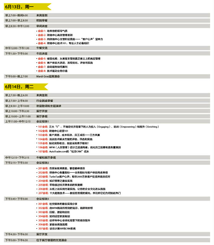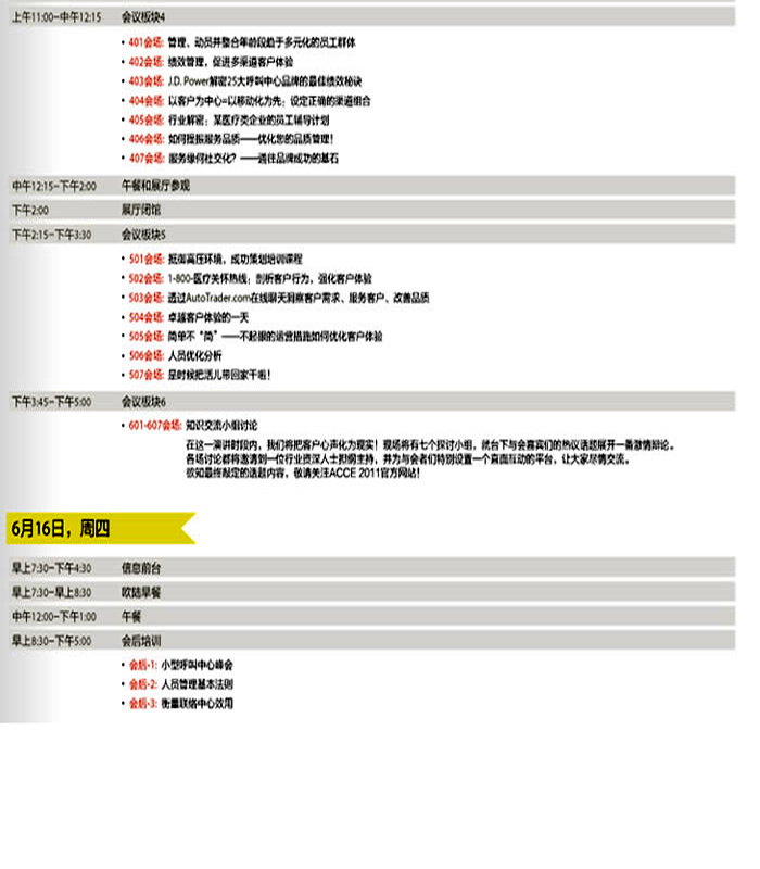 ACCE2011中國代表團由ACCE主辦方國際客戶管理學院(中國區)組織,成員主要來自政府和相關機構、國內大型企業的呼叫中心高級管理和運營等專業人士。 作為主辦方,ICMI(中國區)已帶領中國領先的呼叫中心高管和專家代表共赴盛會,把在中國市場的獲得的實踐經驗與全球行業人士分享交流,同時汲取歐美等主流先進行業精英前瞻性思維和案例經驗。 大會詳細日程: