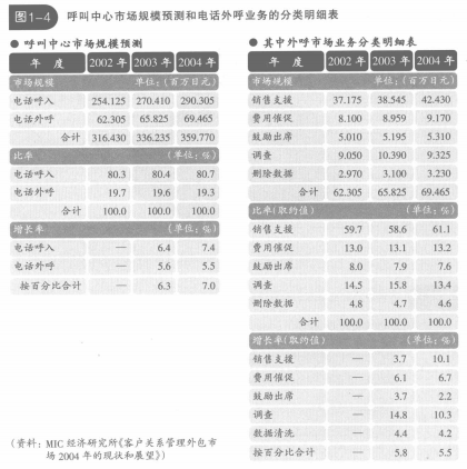 從圖1-7矢野經(jīng)濟(jì)研究所《2004年呼叫中心/互動中心市場的實際情況和戰(zhàn)略展望》中可以看到,外呼在呼叫中心的比例逐年增大,預(yù)計2006年前外呼市場大約能達(dá)到1000億日元的規(guī)模。