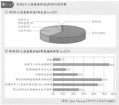 呼叫中心《個(gè)人信息保護(hù)法實(shí)施對(duì)策中,"強(qiáng)化員工道德教育是最多的,占54.9%;接著是強(qiáng)化限制顧客數(shù)據(jù)庫(kù)存取權(quán)限,所占比例為47.9%"加強(qiáng)對(duì)員工(包含外來(lái)訪客)出入的檢查"占43.7%(見(jiàn)圖1-11)。