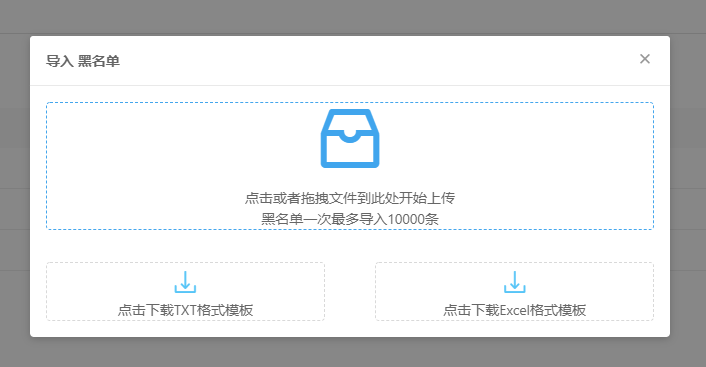 從文件導(dǎo)入黑名單:該操作從文件中導(dǎo)入黑名單號(hào)碼。點(diǎn)擊導(dǎo)入按鈕,彈出如下圖所示數(shù)據(jù)配置框,選擇黑名單號(hào)碼文件,將黑名單文件拖拽至上方藍(lán)色虛線框內(nèi)或者點(diǎn)擊導(dǎo)入文件。