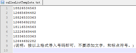 上傳呼叫名單時(shí),與黑名單號(hào)碼一樣,具有去掉重復(fù)號(hào)碼的功能,也就是說(shuō)說(shuō)導(dǎo)入每一個(gè)號(hào)碼的時(shí)候會(huì)檢驗(yàn)系統(tǒng)中是否已經(jīng)存在此號(hào)碼,如果不存在方可繼續(xù)導(dǎo)入。導(dǎo)入呼叫名單時(shí)號(hào)碼不可超過(guò) 10W 個(gè),否則因系統(tǒng)上傳壓力過(guò)大導(dǎo)致上傳號(hào)碼失敗。呼叫名單同樣提供了 txt、Excel 格式的導(dǎo)入模板,點(diǎn)擊兩個(gè)模板即可下載,模板效果圖例如下圖所示。