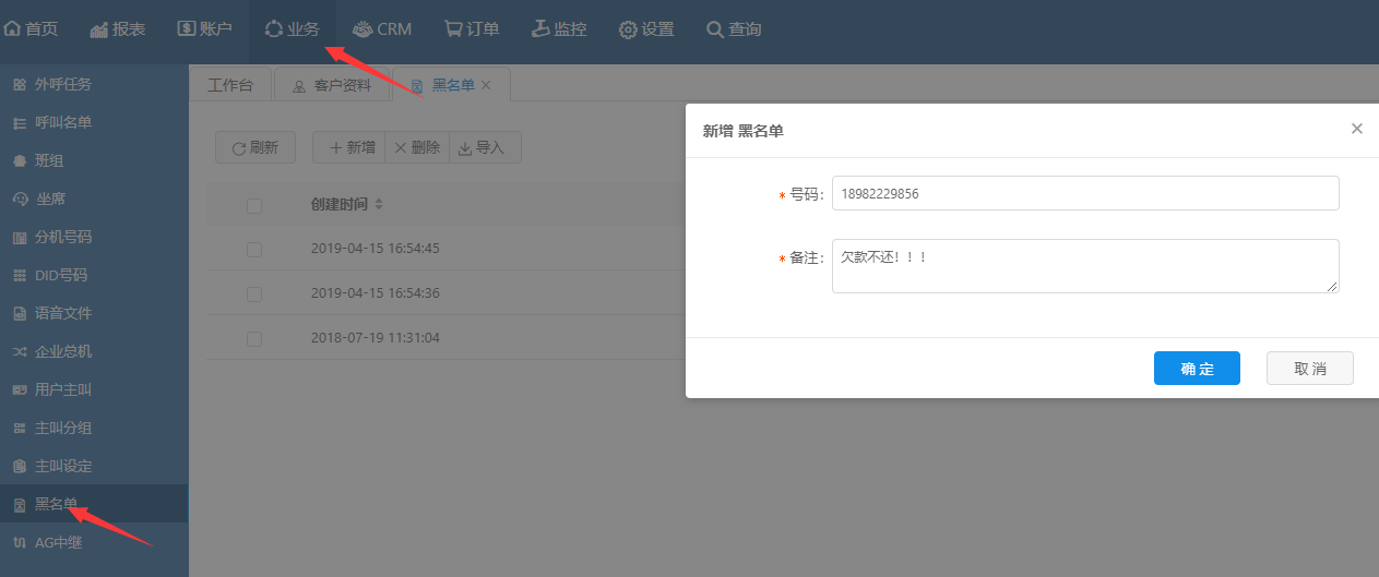 單個(gè)新增:該操作新增加一個(gè)黑名單號(hào)碼。點(diǎn)擊業(yè)務(wù)-再點(diǎn)黑名單,然后點(diǎn)擊新增按鈕,彈出如下圖所示的數(shù)據(jù)配置框,填寫電話號(hào)碼、備注,點(diǎn)擊確定按鈕,即可成功增添一條黑名單電話號(hào)碼。