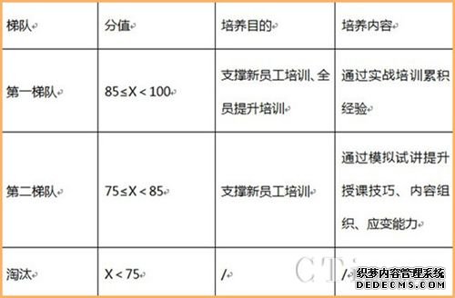 第二梯隊培訓師的考評,以最后一次試講的表現進行評估,達到第一梯隊標準的即可升入第一梯隊進行培養。