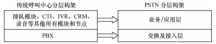 傳統呼叫中心技術的大部分節點,對應的是PSTN(Public Switched Telephone Network,公共交換電話網絡)的業務/應用層,如IVR、排隊模塊、CTI服務器、錄音等模塊和節點,而傳統的交換機設備,即PBX,對應的是交換及接入層。傳統呼叫中心與PSTN分層的對應關系如圖: