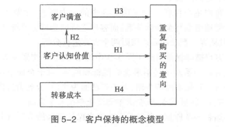 圖5-2所示為客戶保持的概念模型,它描述了客戶保持的決定因素(客戶滿意、客戶認知價值、轉移成本)與客戶保持績效的度量維度(重復購買的意向)之間的關系。