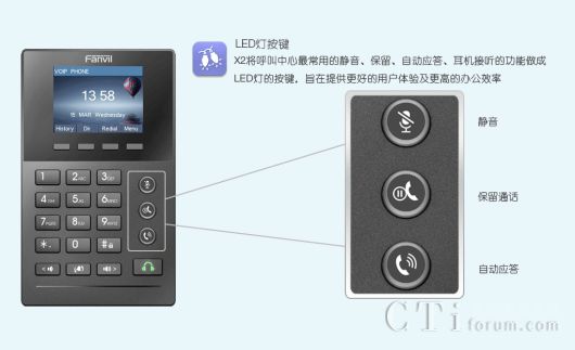 LED按鍵,這款產品將最常用的靜音、保留、自動應答、耳機接聽的功能做成了LED燈的按鍵,用戶可以根據LED狀態看到目前的使用情況