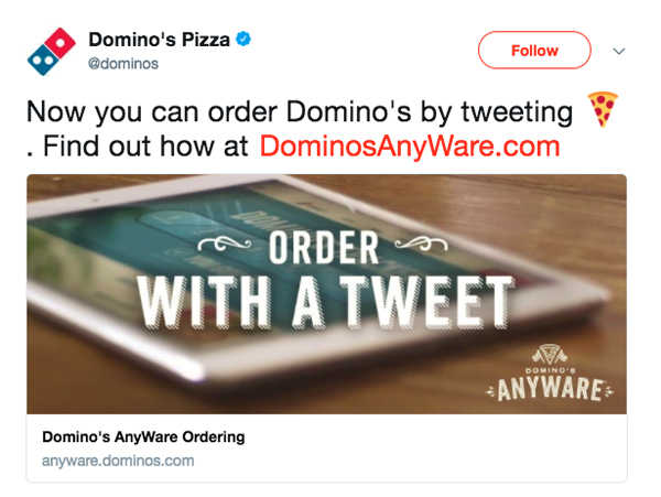 一個很好的例子是Domino'sPizza的Twitter.Domino's允許客戶通過簡單地共享表情符號來訂購披薩,然后,Domino的機器人會發送這些訂單,并在必要時提出其他問題。