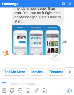 另一個很棒的智能客服機器人來自Fandango,與您可以省去許多時間,對Moviefone的選項進行分類的日子,您現在可以訪問Fandango的社交個人資料,并利用其聊天機會查找您附近的電影院和電影播放時間。