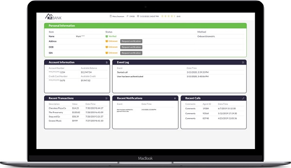 銀行客戶進行身份驗證時的座席儀表板。在此圖像中,座席可以看到此人已經驗證了其姓名(使用移動應用程序上的面部識別)。然后,座席可以通過移動應用請求其他項目的驗證,例如地址,出生日期或SSN。座席在身份驗證過程中永遠不會看到SSN,出生日期或地址。