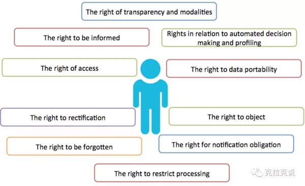 個人和企業之間分別可以對這些數據進行怎樣的伸張和利用?歐洲GDPR可以告訴我們如何去實踐。消費者擁有最基本的信息的被告知權、選擇權和遺忘權。所謂的被告知權就是說當消費者開始瀏覽網頁或者通話時,企業必須明確告知數據會被你收集、記錄和存儲。進一步延伸而來選擇權定義了消費者可以要求企業對其數據有不被收集、記錄和存儲的權利。而遺忘權就更厲害了,相應的數據在生成之后,消費者可以主動致電聯系企業,要求對自己所參與生成的這些數據選擇部分/全部遺忘。真是妥妥滴消費者至上利益保護!