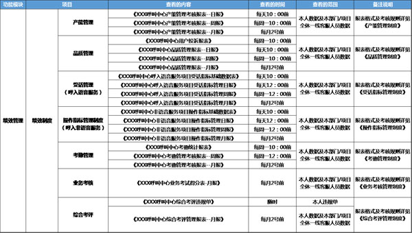 A. 所謂無規矩不成方圓,制度是呼叫中心運營的框架,制度的有效實施能夠使呼叫中心各方面的工作均在有章可循、有章可依的條件下進行。同時,將制度的實施過程和結果進行量化,就構建起了呼叫中心的績效管理體系。呼叫中心的績效管理體系又可切分為兩部分:績效制度和績效方案,關于績效考核制度和績效考核方案的具體內容,請見本章第二節《過程精細化管理》-建制度部分。